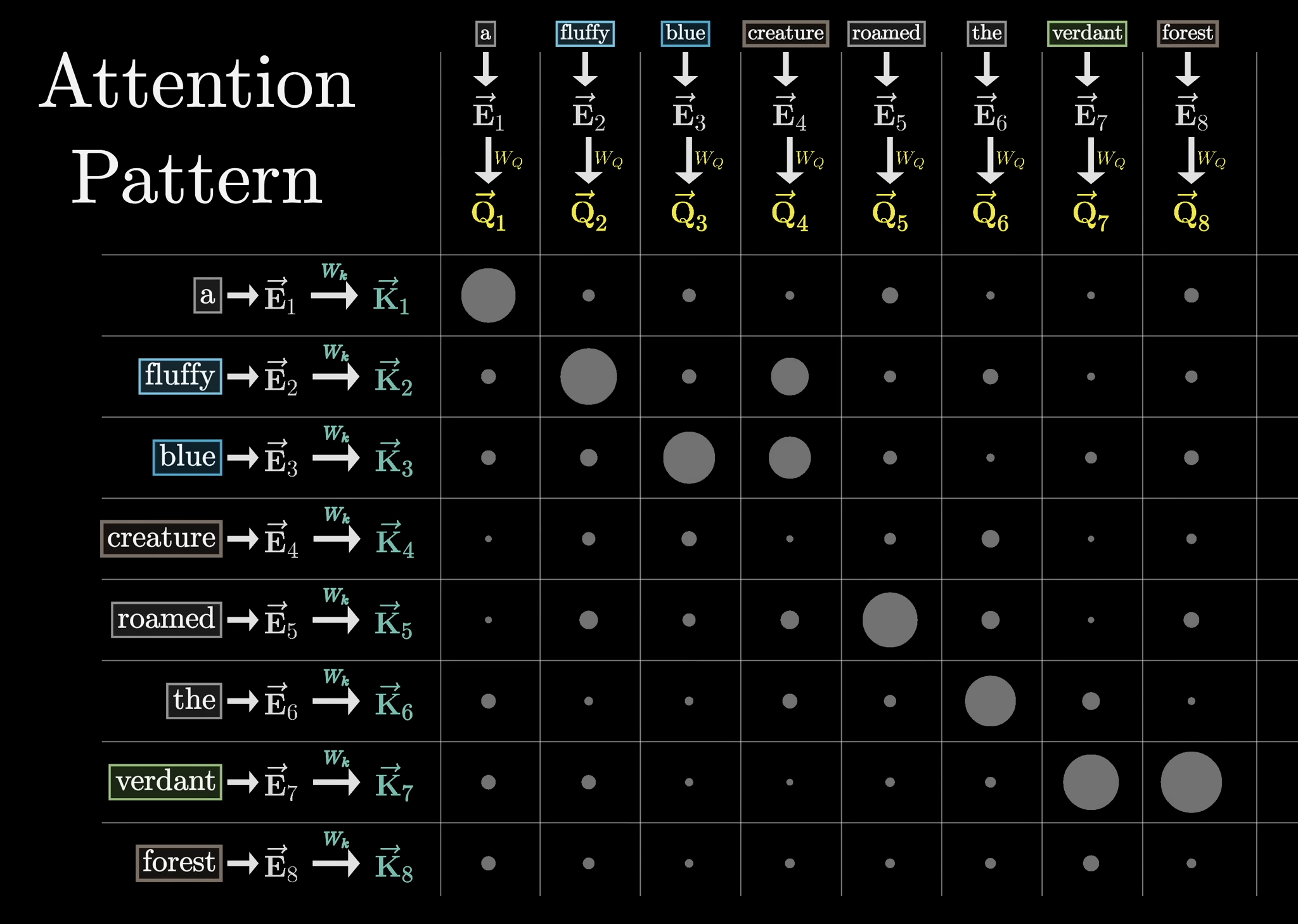 By getting the dot product of every Query Vector with every other Key Vector, we can see how much each word “attends to” every other word. We then apply softmax, column by column. In the below example, “fluffy” and “blue” attends to “creature”, and “verdant” attends to “forest”. (Size of the dot represents positive magnitude of softmax’ed dot product).