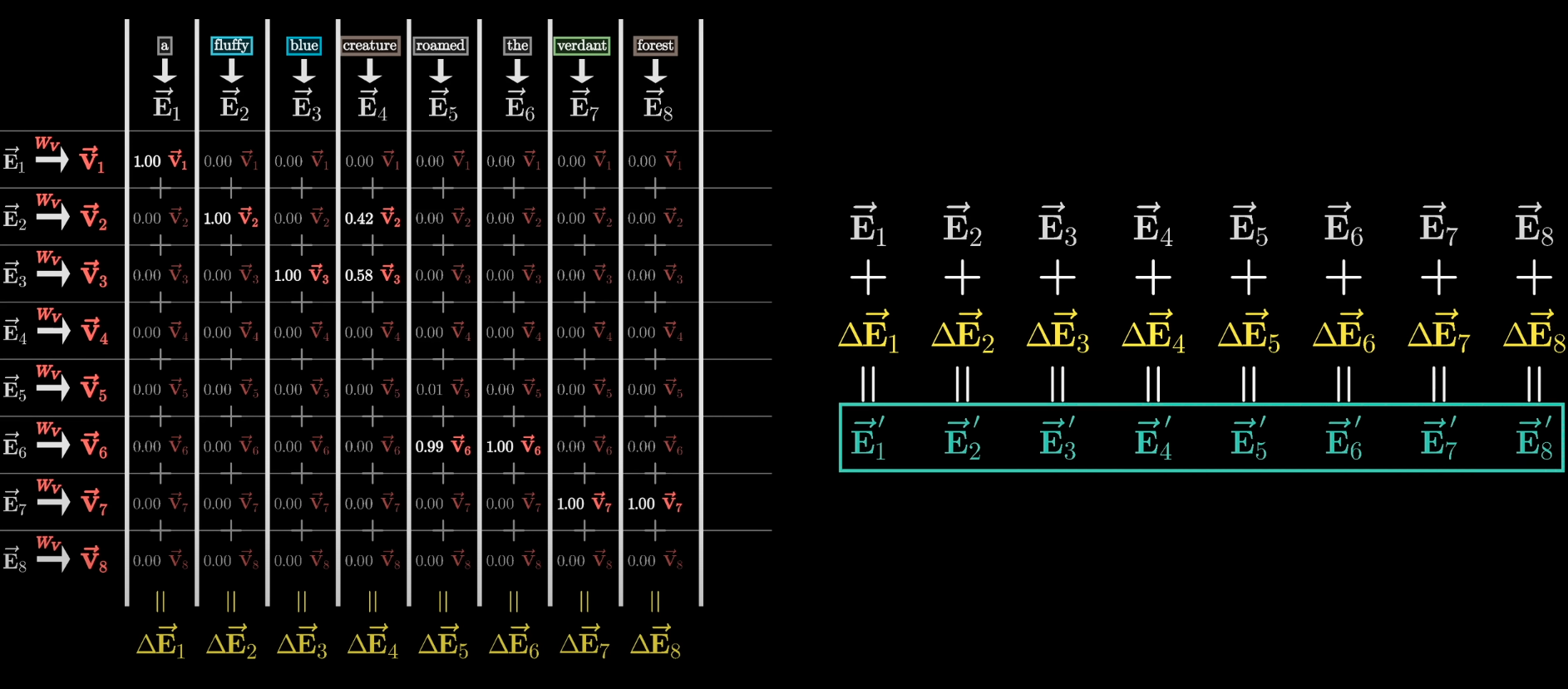 Ideally, an “Attention Block” will change (i.e. add/subtract to) those individual word vectors, so they (the vectors signifying the meaning of a word) move to a more accurate position (i.e. a position more reflective of its actual meaning).