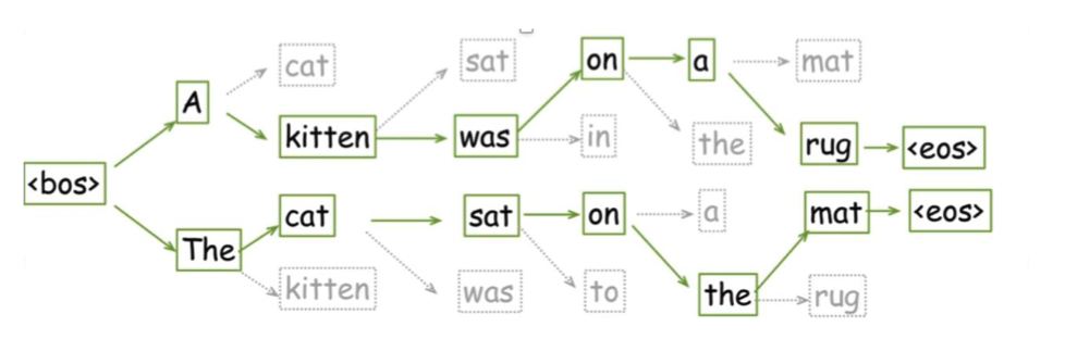 The best sequence of tokens in a Language is not necessarily picking the best token at each step. We can do beam search to find it.