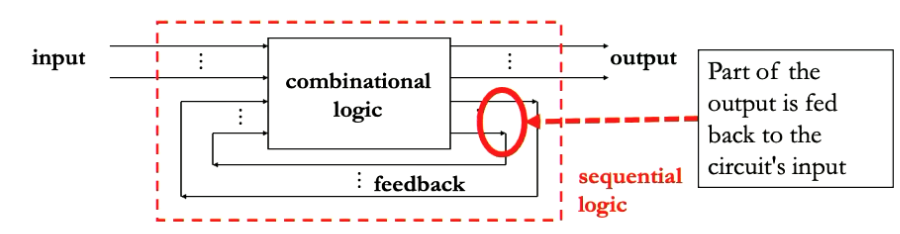 - Simply: These blocks have memory and their output is a function of the input as well as the history of past inputs, (the state). Lowkey just a Combinational Logic Block but with a memory bit added. Example: