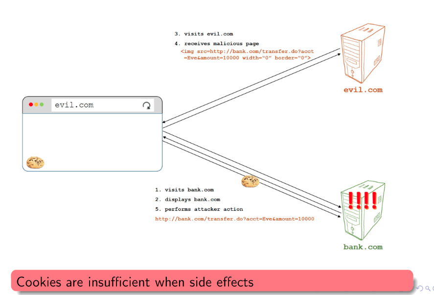 evil.com) tricks the userâs browser into making a request to a trusted one where the user is already authenticated (bank.com). - Remember cookies have a
