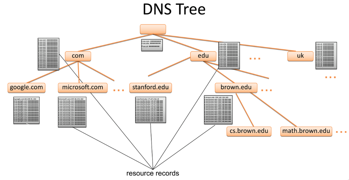 How do you actually find out what IP Address is at google.com? The DNS protocol. It’s application-layer. Similar to Domain, it’s the many-to-many mapping. The Name Server are the thing that actually hold the information.