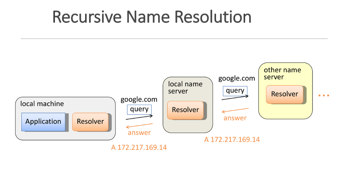 Similar vibe, except the servers do the searching for you. Notice that this way, all of the name servers learn about the full domain on the way. TODO: NEEDS CLARIFICATION