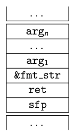 Again, a different flavour of buffer overflows. String formatting functions can take a variable amount of parameters. EG: printf("Hey {0} {1}! Today is {2}...", arg_0, arg_1, ..., arg_n). The stack’s representation of that looks like this: