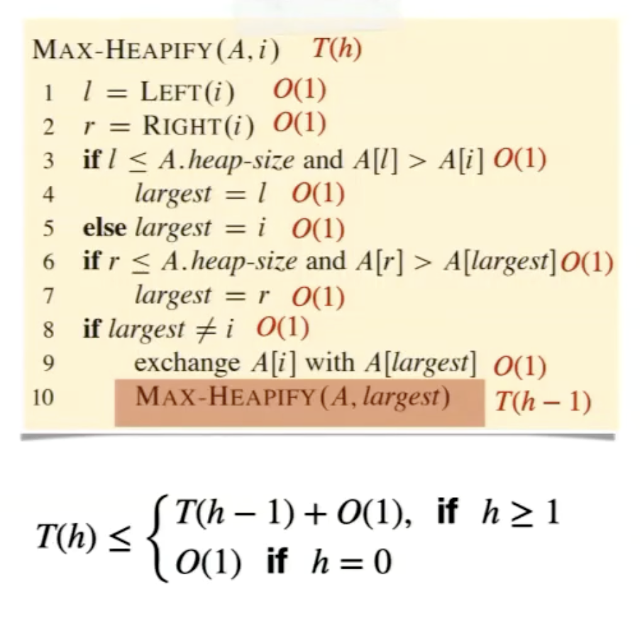 Think for a second. If all operations in heapifying are constant bar the actual recursive step, the only thing that will determine the time complexity is how many iterations you call. This is going to be the height of the node at which you called it. If you have a n items, it will be .
