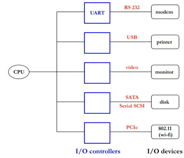 You get a I/O (Custom) Controller that speaks directly to the device. Take below. All of the devices are connected via a different means (which all have different standards). Thus, we need custom controller to manage all of them with different standards themselves. The O Interface would be the RS232 for example.