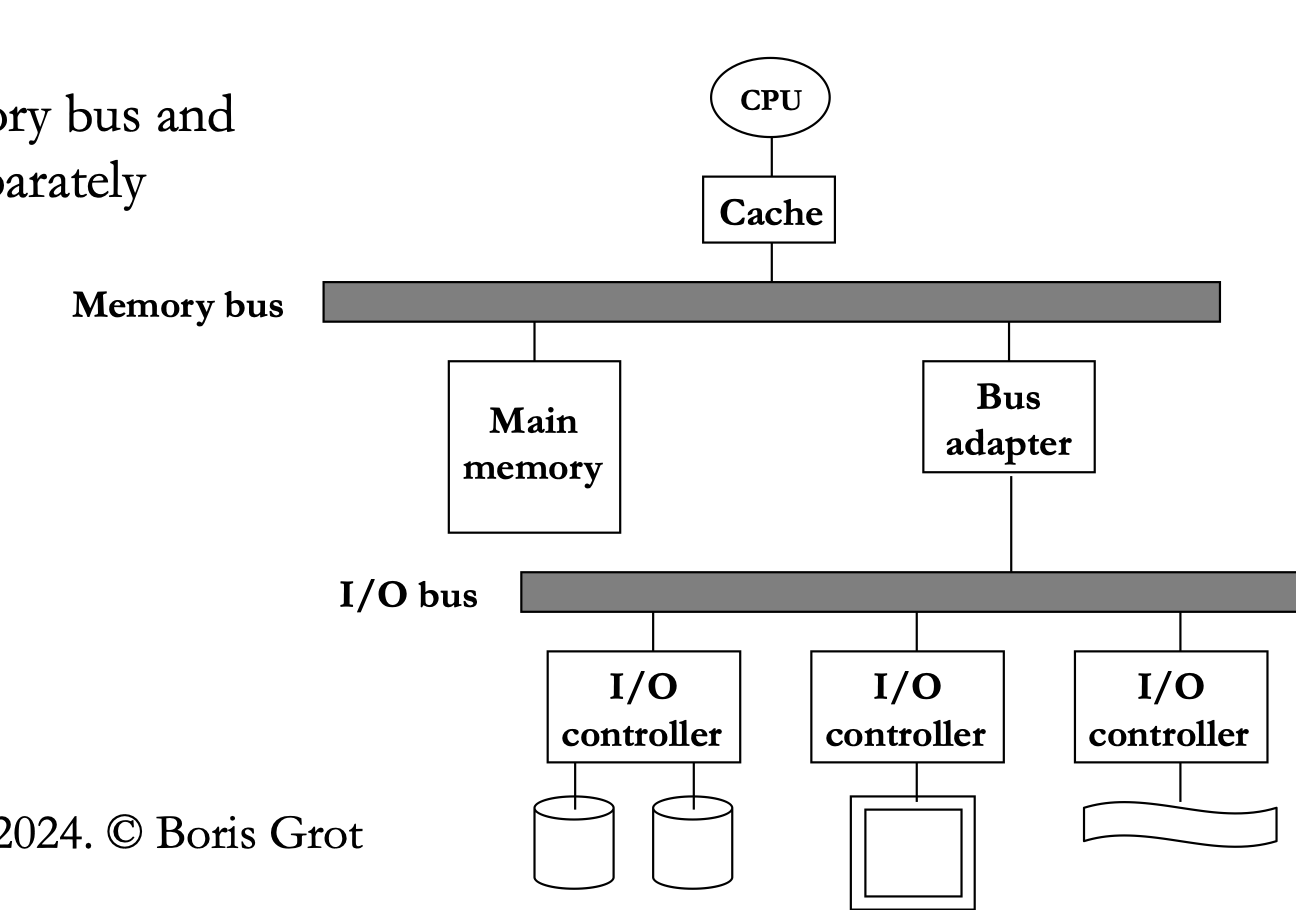 - Interrupt: I/O controller interrupts user process to signal an I/O event. (Very heavy) → But better as it happens less frequently.