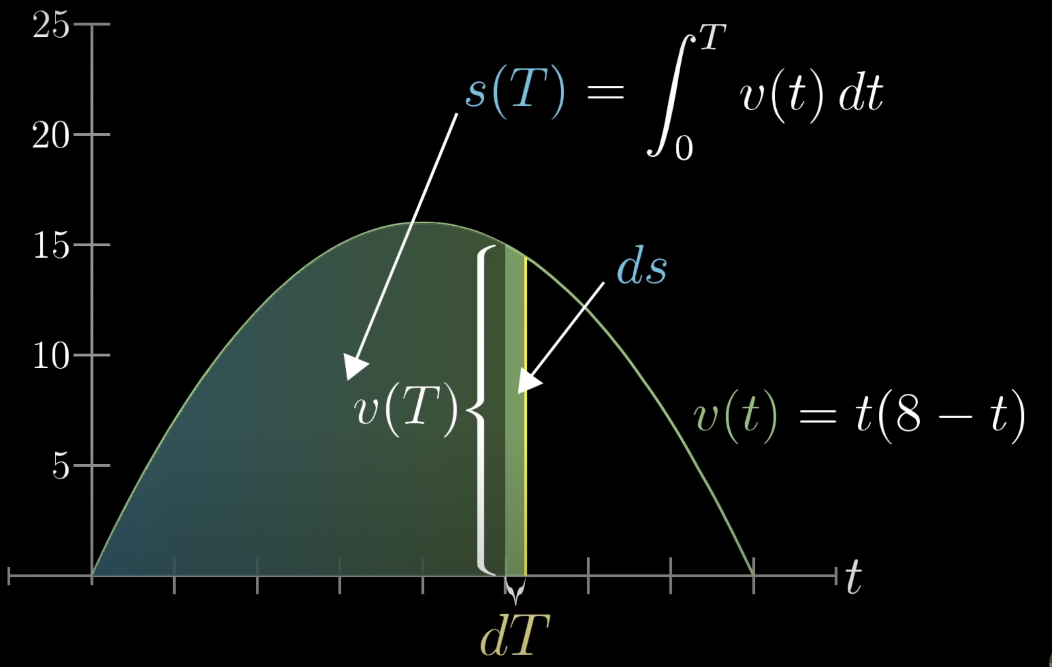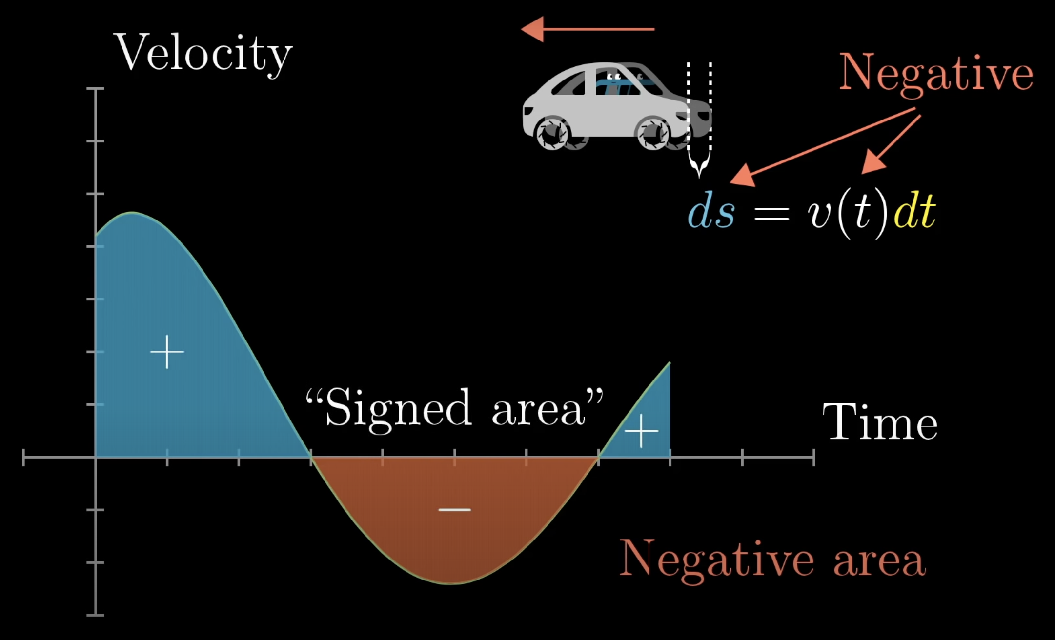 Imagine you have a car travelling a displacement , where is a specific time on his journey. He gradually speeds up, steadies out and slows down. His velocity at any one time is .
