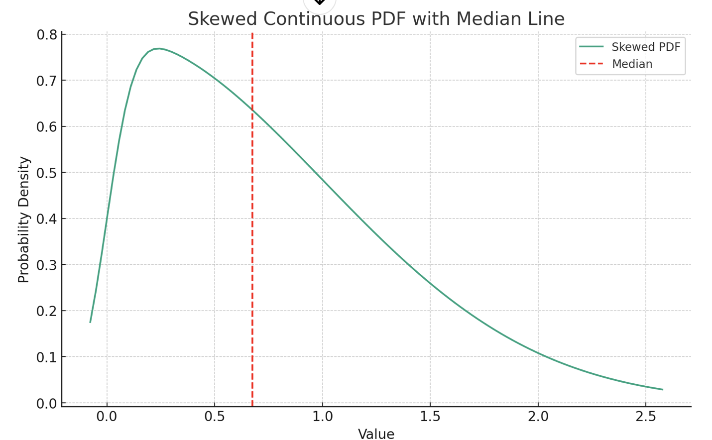 The median is the 50th percentile of a distribution, meaning it’s the value that divides the distribution in half. In a continuous distribution, it’s the value m for which