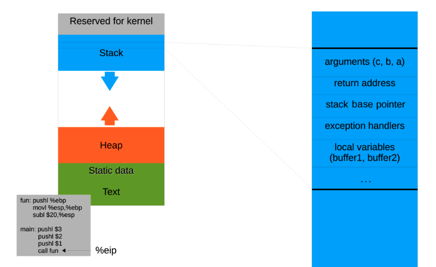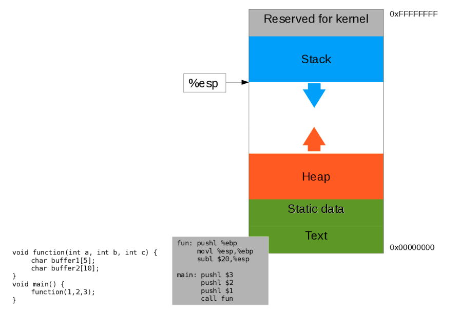 %eax- The main register for holding results of arithmetic%ebx- The main register for holding data.%esp- Extended Stack Pointer - Points to the top of the stack. This updates every new operation that’s done.%ebp- Extended Base Pointer - Whenever you jump to a new function, this points to the base of that function.