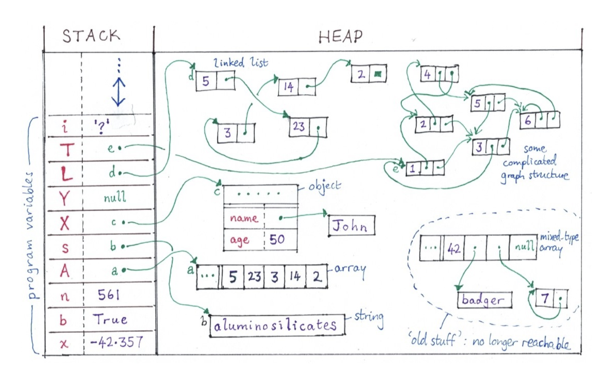 - Imagine changing data addresses within the Heap. Some data can become unreachable, as is seen in the diagram (imagine popping off the last few items within an array). Normally, in good languages (Python), the Garbage Collector detects it and reclaims the space once occupied.