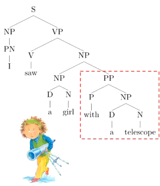 Was she on the floor, eating a pizza? Or was her pizza on the floor? Alternatively, the telescope example above could be written with a different tree, thus having a different meaning, but still be syntactically valid. In the below case, the girl has the telescope. In the above case, you were a weirdo: