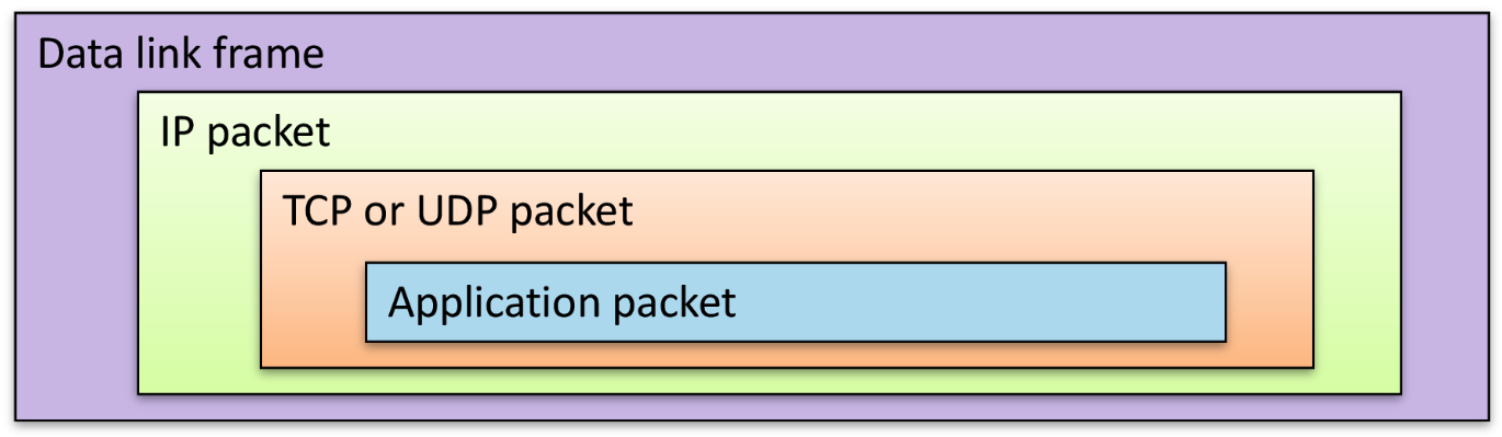 - Data is split into packets (Eg. Request header and payload). Packets contain source and destination IPs