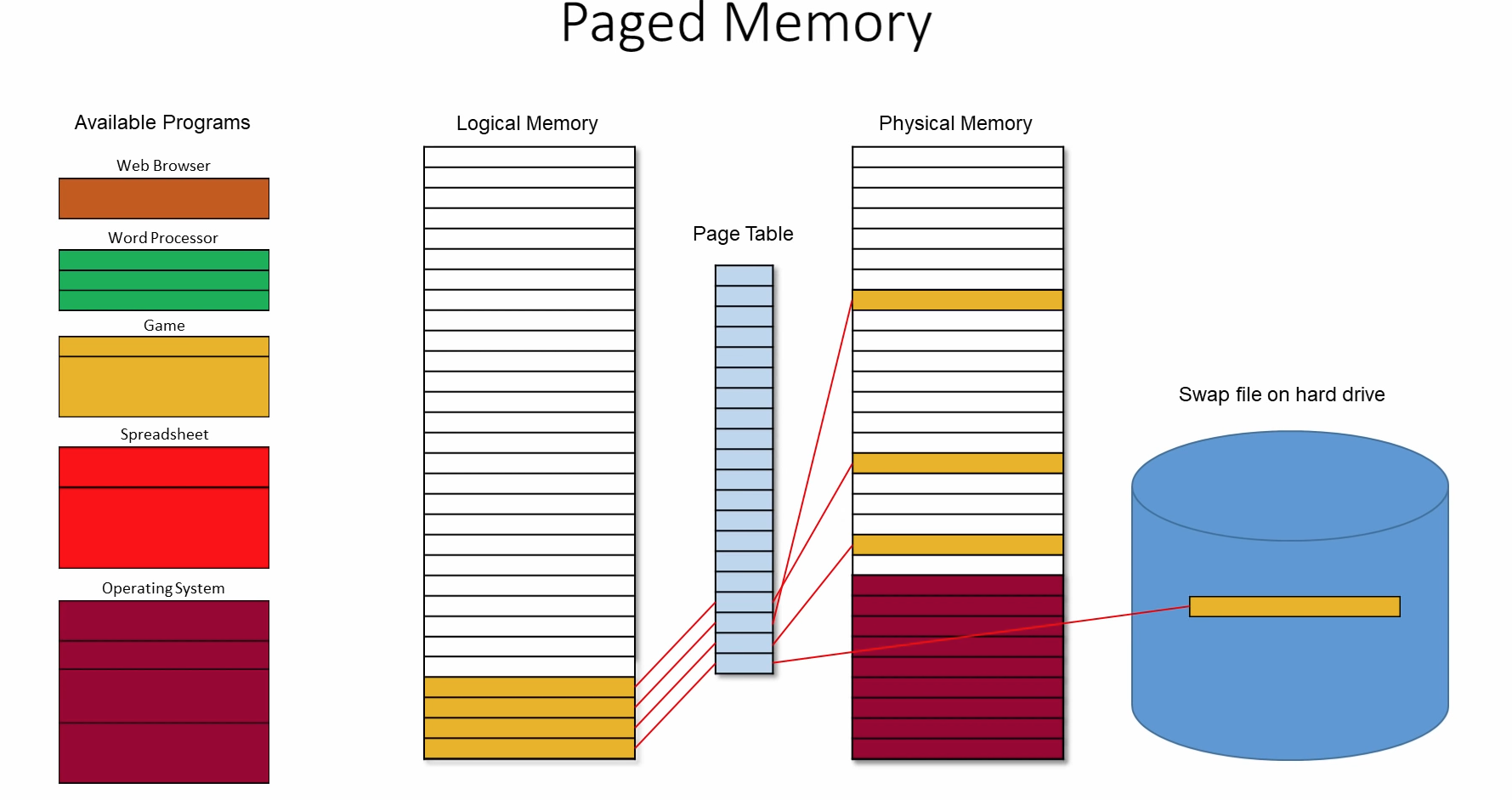 If we keep swapping between Safari, Obsidian and VSCode, but left Adobe PDF reader on the background, Adobe would likely get swapped to the hard-disk, while the other 3 are left in RAM. If we want to use it, we’d simply swap it in and maybe move Safari to the main disk (if there’s no space left in Physical memory). This is the exact reason computers with more RAM feel faster when switching between programs, because they don’t have to load it up from hard disk as they’re all stored in physical memory.
